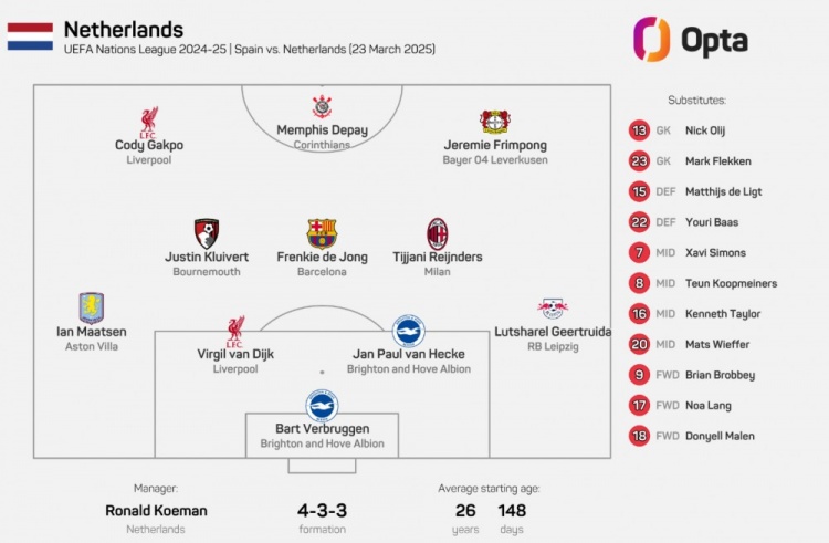 2025-03-24 09:38:492017年11月9日以来,荷兰首发阵容首次无荷甲球员