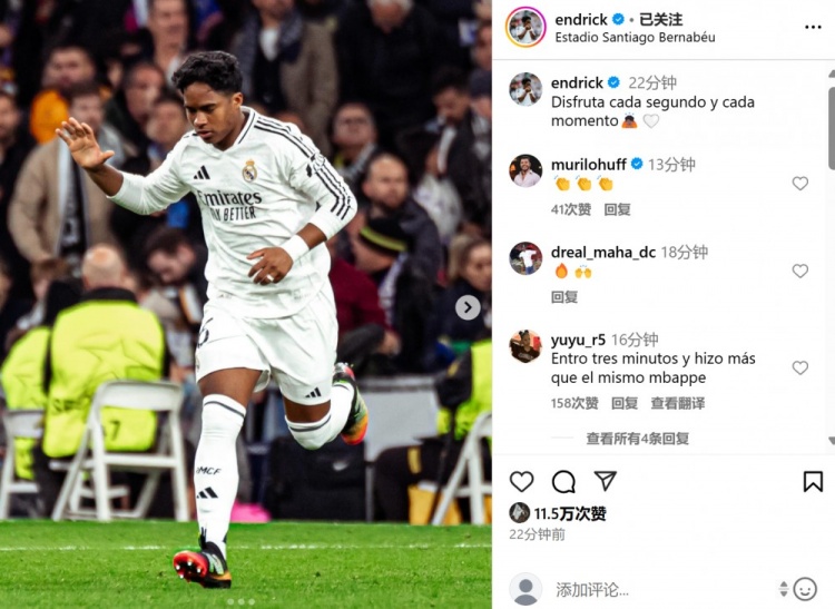 2025-03-05 11:43:27替补登场迎欧冠淘汰赛首秀,恩德里克社媒晒照:享受比赛每个瞬间